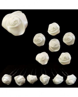 Lot de 6 Charmantes épingles à cheveux. Chaque épingle est surmontée d'une rose en satin BLANC Cassé. Diamètre de la fleur : environ 2 cm.