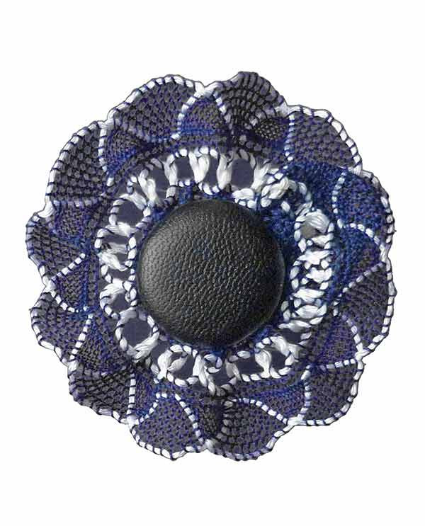 Un Broche en forme de fleur stylisée ronde, en dentelle de coton bleu marine avec des fils couleur blanche qui soulignent les formes des pétales. Le centre est un cabochon en imitation cuir noir.