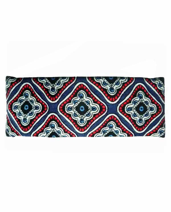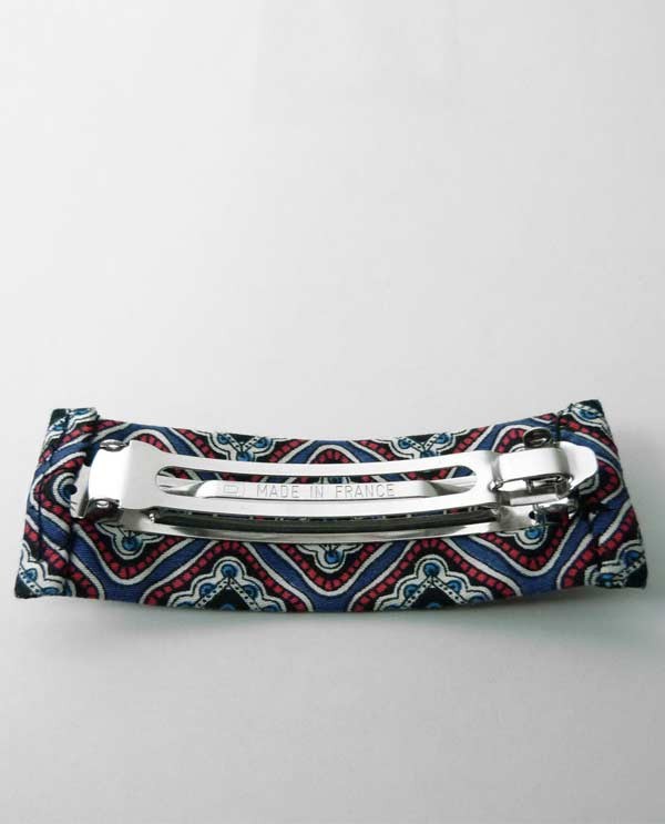 Une barrette à cheveux en forme de rectangle en tissu a motifs multicolores : bleu, blanc, rouge et noir, dans un style abstrait d'inspiration ethnique.