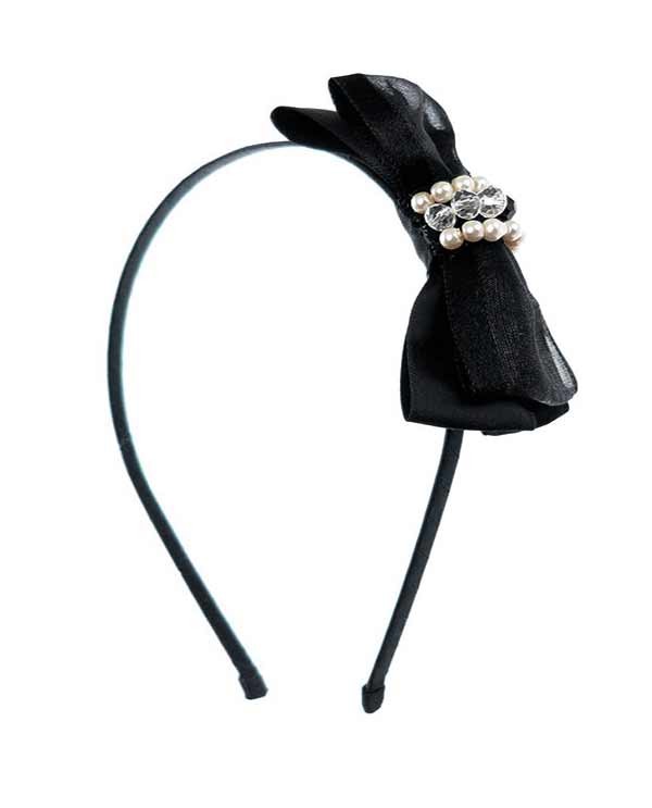 Un serre-tête fin décoré d'un noeud noir en satin et organza. Son positionnement légèrement sur le côté de la tête est très charmant. Des perles nacrées blanches offre une note chic à ce modèle
