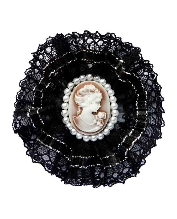 Broche gothique noire gothique, inspirée de l'époque victorienne avec son camée, ses perles nacrées et sa dentelle noire plissée. Elle fait aussi office de pince pour la porter en bibi dans les cheveux. Un bel accessoire de mode, dans un style "à l'ancienne".