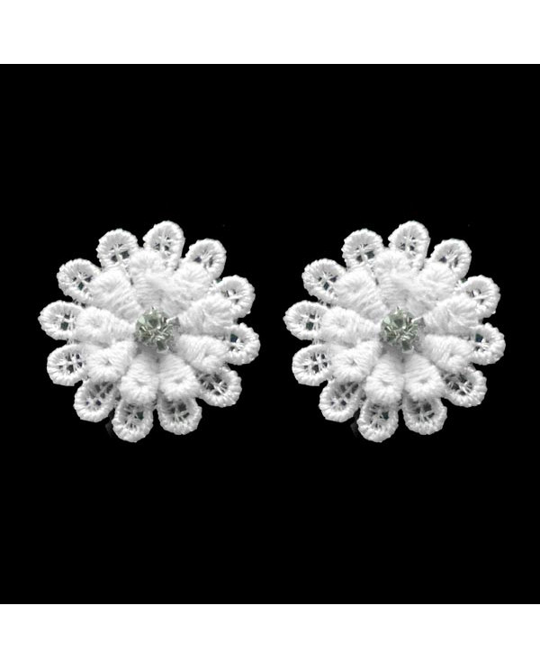 Boucles d'oreilles puces en formes de fleurs rondes en dentelle blanche, ornées d'un strass effet cristal.