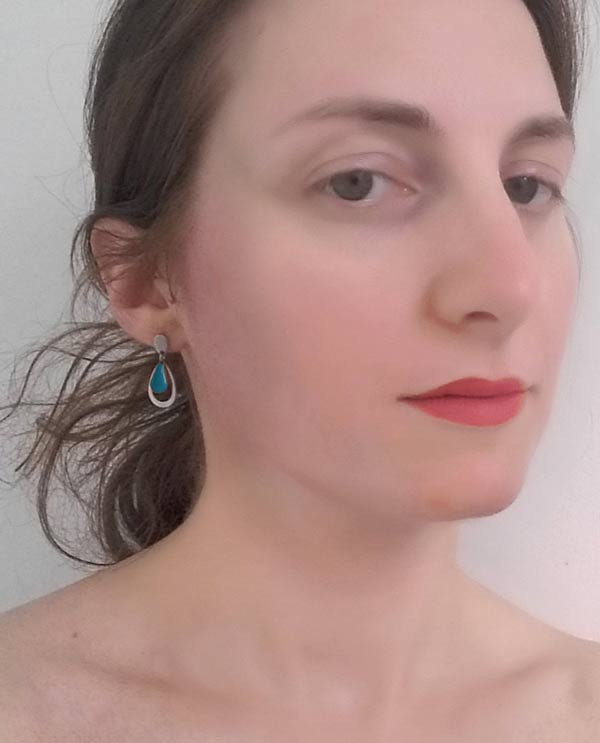 L'acier inoxydable (ne rouille pas, hypo-allergénique), avec sa teinte argenté foncé caractéristique s'associe à une belle touche de couleur, ici du bleu pétrole rétro (la petite goutte de couleur est en laiton peint a l'époxy en recto et verso.