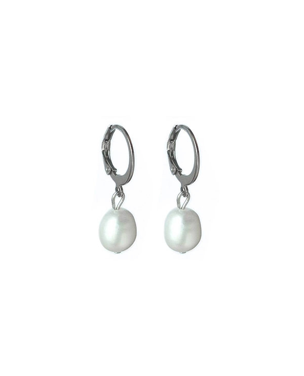 Boucles d'oreilles classique blanches, de type mini créoles, en acier inox, avec une perles d'eau douce blanche élégante, de forme ovale légèrement irrégulière (comme elles sont naturelles, leur forme exacte est a chaque fois unique).