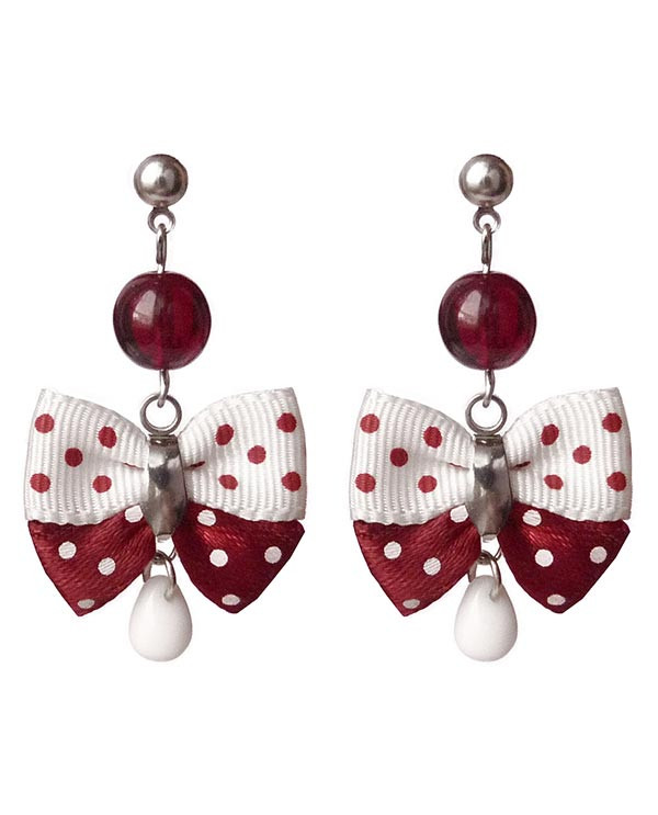 Vous aimez le style rétro? Ces boucles d'oreilles noeud, en forme de papillons, sont en tissu et satin à pois rouge bordeaux en blanc, inspiré des années 50 et des pin up.