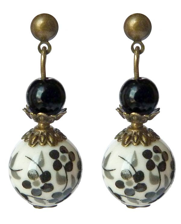 Boucles d'oreilles noires et blanches , en porcelaine, dans un style rétro fleuri.