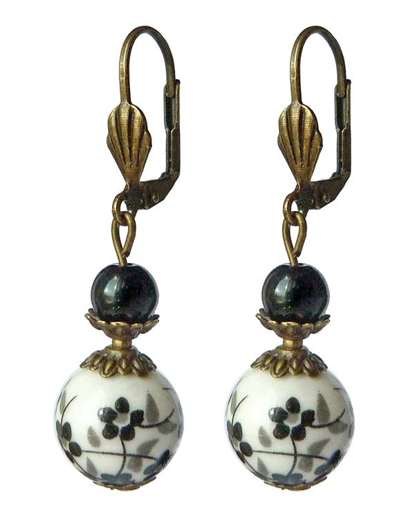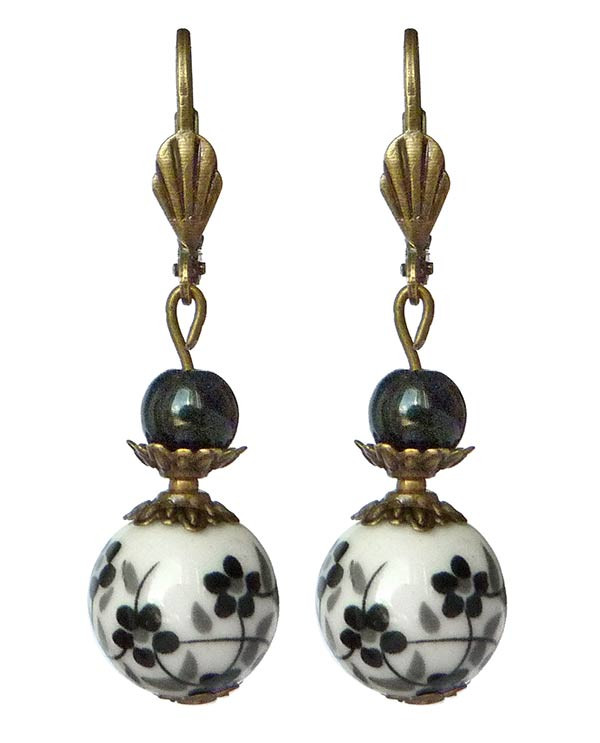 Une paire de boucles d'oreilles pendantes à l'aspect rétro, avec ses perles en porcelaine à fleurs noires sur fond blanc.