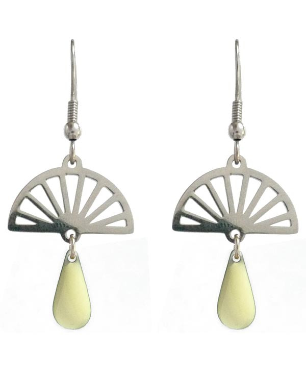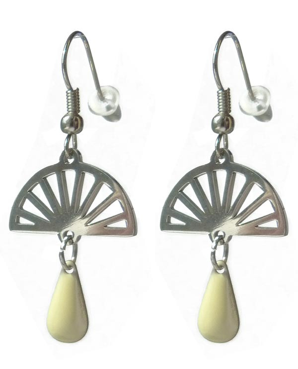 Ces boucles d'oreilles légères sont composées d'une paire d'éventails argentés, accompagnés de petites gouttes en laiton entièrement émaillées de beige, recto verso.