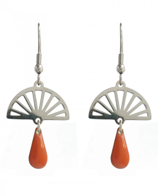 Boucles d'oreilles légères ornées d'un éventail argenté en inox et de petites gouttes orange vif.