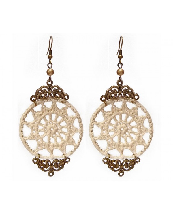 De belles boucles d'oreille au romantisme bohème, en coton au crochet blanc cassé écru (blanc naturel), dans un genre romantique chic un peu champêtre, très voyantes tout en étant d'un poids raisonnable.