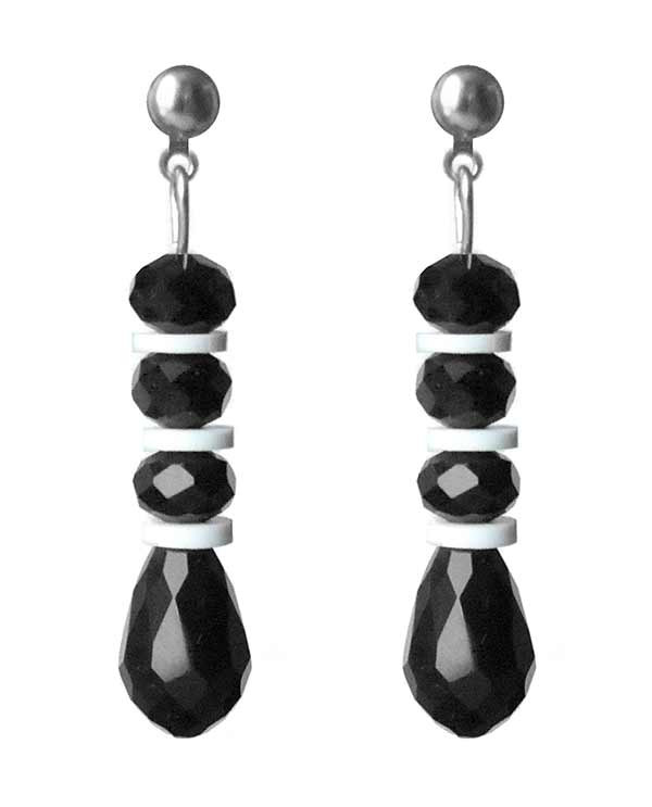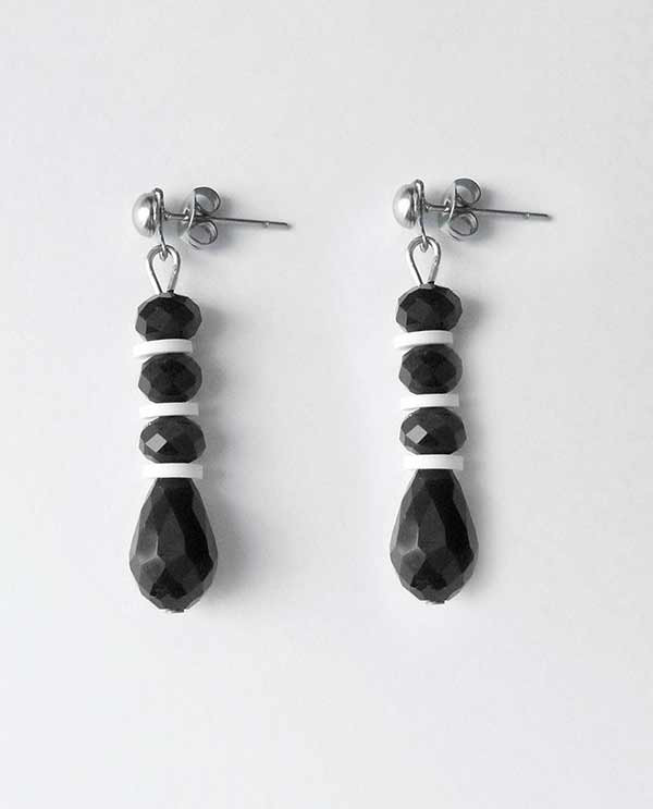 Une paire de boucles d'oreilles rythmée de noir et blanc opaque, terminées par des gouttes assorties. Pour ce modèle, les attaches sont des tiges sobres en acier inoxydable argenté.