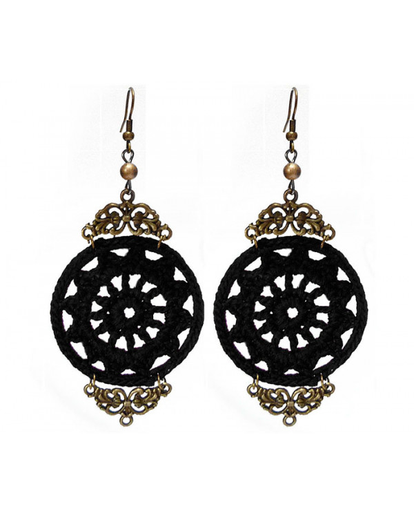 Grand cercle ornée de dentelle au crochet en coton noir et d'éléments couleur doré bronze.