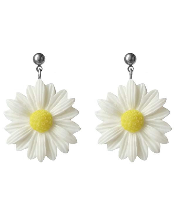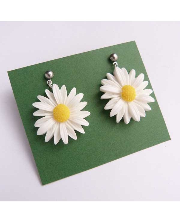 Petites boucles d'oreilles en forme de pâquerettes (en résine blanche et jaune), bijoux bucoliques évoquant les beaux jours.