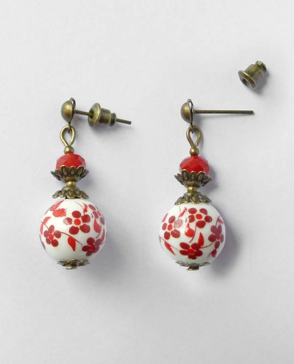 Boucles d'oreilles, en porcelaine blanche à fleurs rouge, dans un style rétro fleuri.