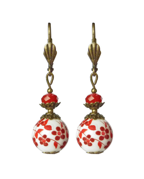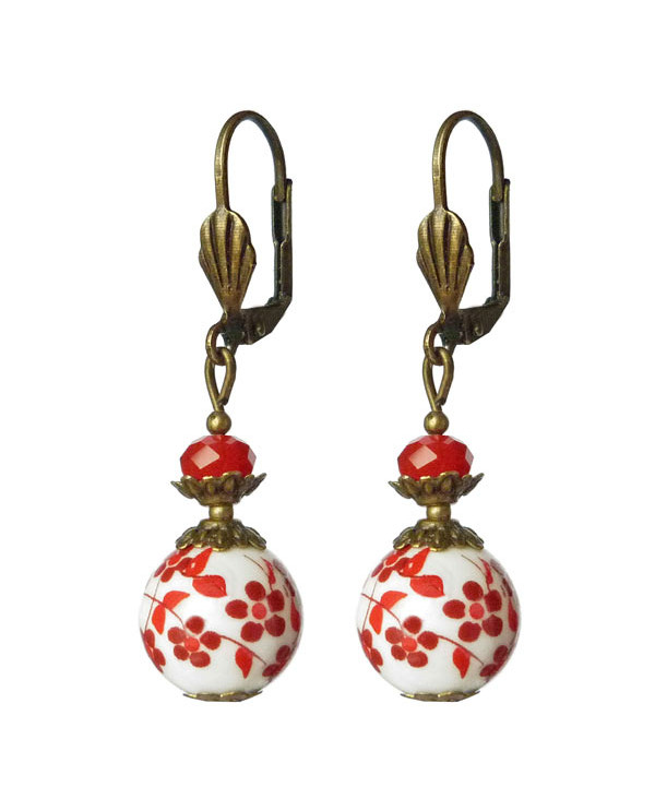 Une paire de boucles d'oreilles pendantes à l'aspect rétro, avec ses perles en porcelaine blanche à motif de fleurs rouge.