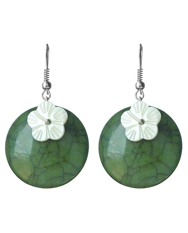 boucles d' oreilles fleur blanche en nacre et cabochon vert marbré.