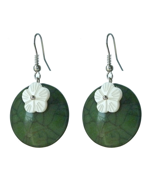 Des boucles d' oreilles avec des fleurs blanches en nacre (naturellement blanc) et un cabochon vert marbré en acrylique, beaucoup plus léger que si cela avait été en pierre.