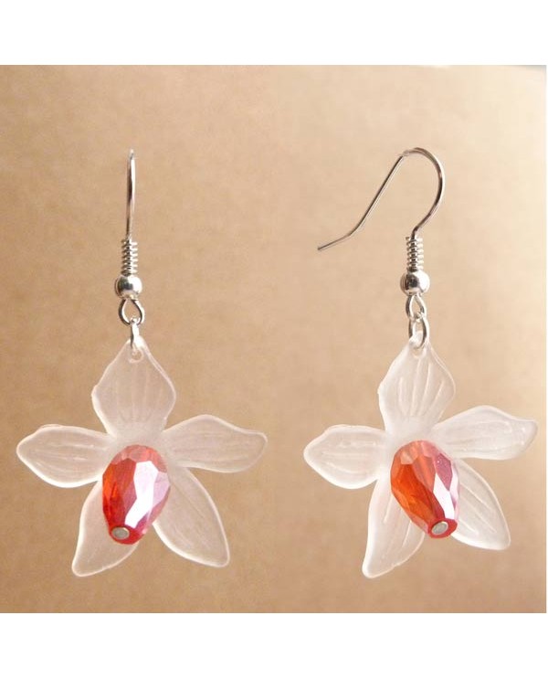 Boucle d' oreille , fleurs blanches, rouge au centre.