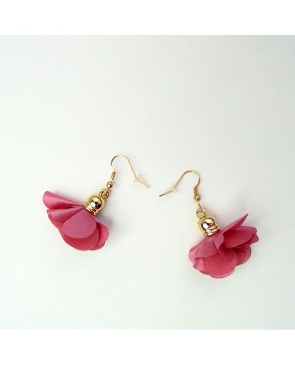 Boucles d'oreilles pompons floral rose fuchsia en satin avec une monture dorée.