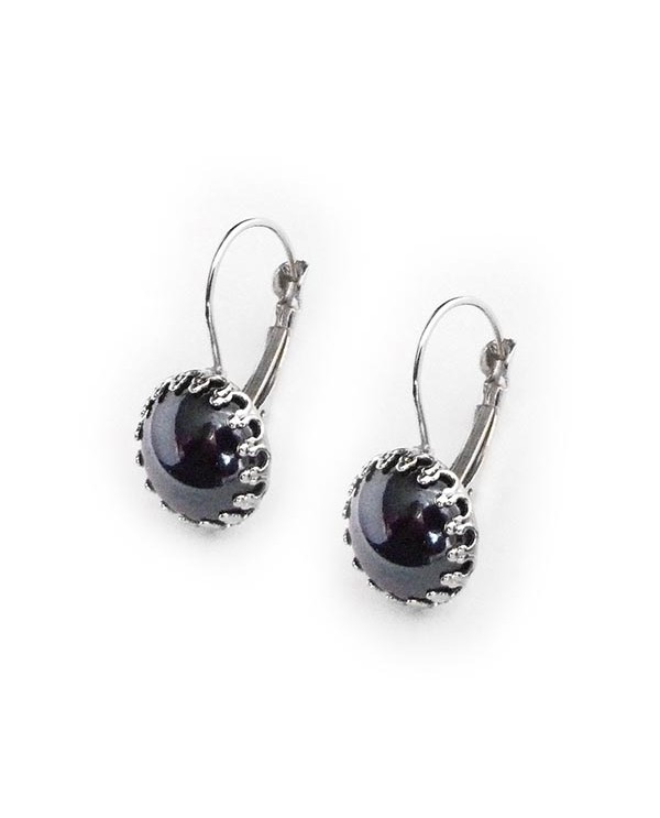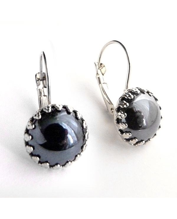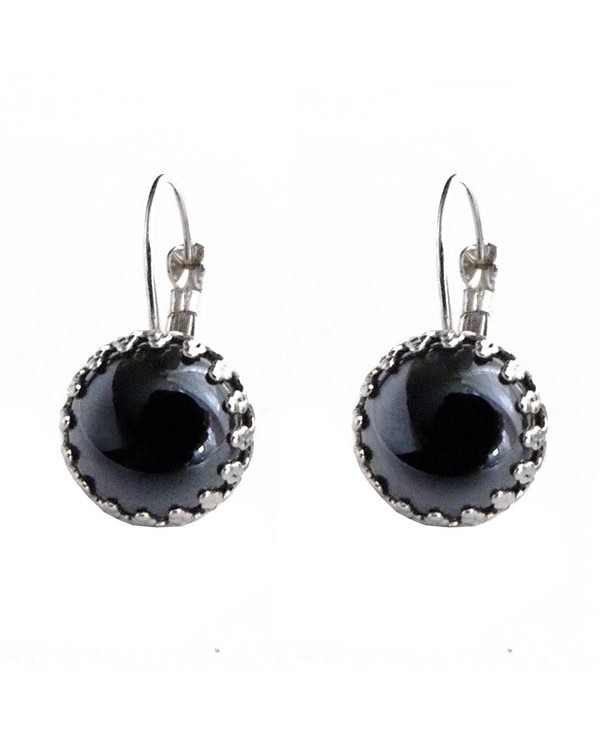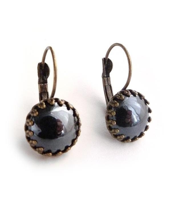 Boucles d'oreilles dormeuses au style rétro, accentuées par un cabochon gris anthracite (presque noir). Attaches argentées ou bronze au choix. Livraison suivie.