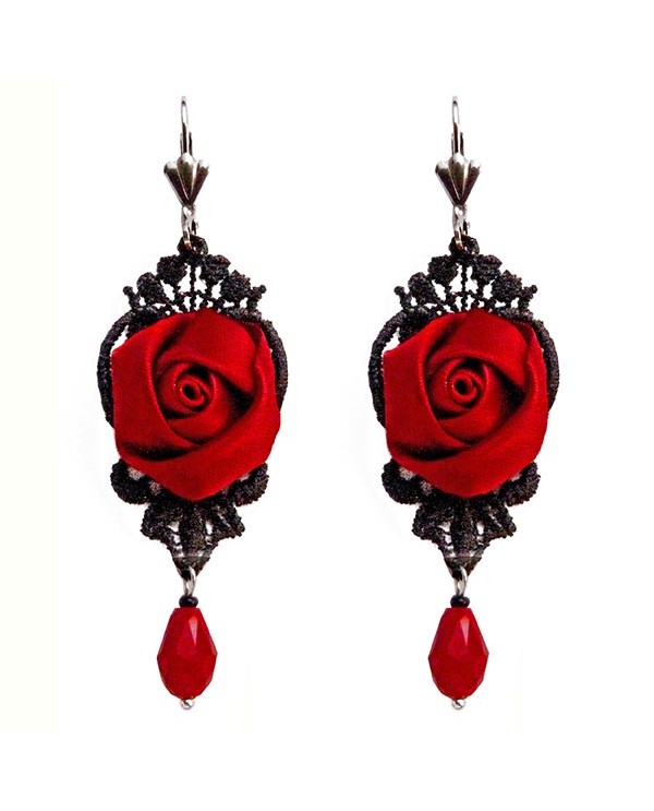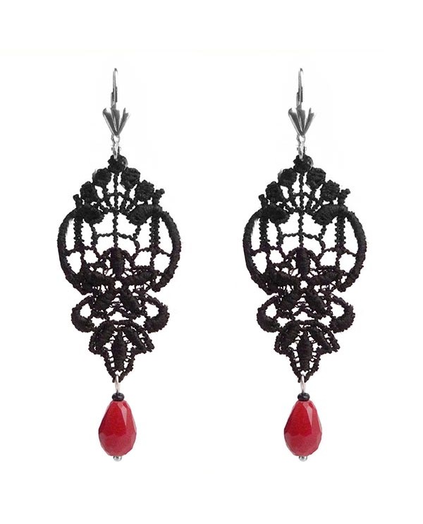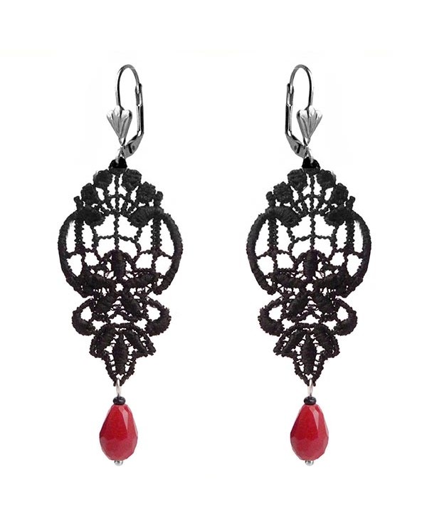 Modèle 1 : Dentelle Seule : Le motif floral peut se suffire à lui même. Légères et délicates, ces boucles d'oreilles sont réhaussées de gouttes rouge vif.