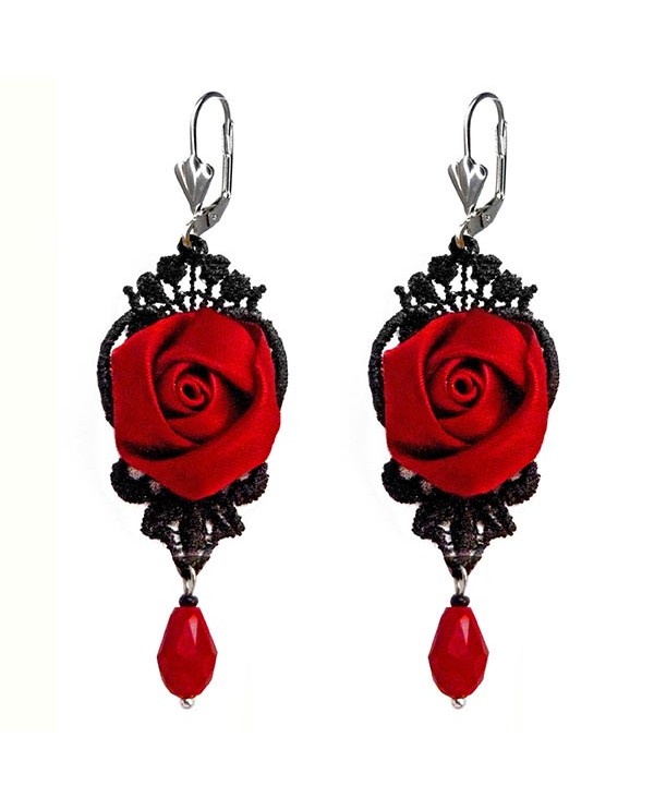 Ces boucles d'oreilles en dentelle noire, ornées de fleurs et de gouttes rouge, sont d'une élégance intemporelle elles captivent par leur sophistication. Un beau contraste de couleur pour une femme élégante, cela ajoute une touche chic et subtilement rétro à votre style. Elles ont un charme unique, entre passé et modernité.