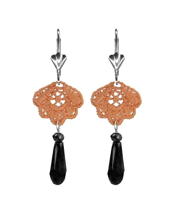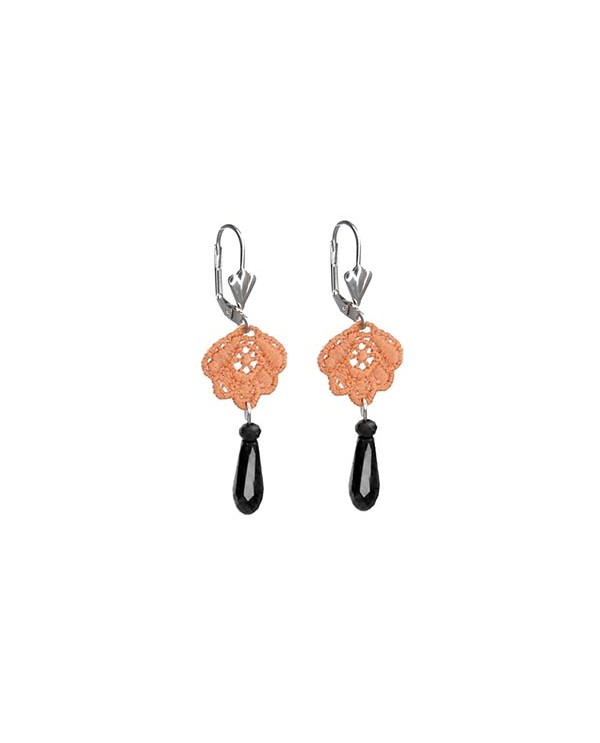 Voici une paire de boucles d'oreilles composées d'un fleur de dentelle orange très légère et de perles en forme de gouttes.
