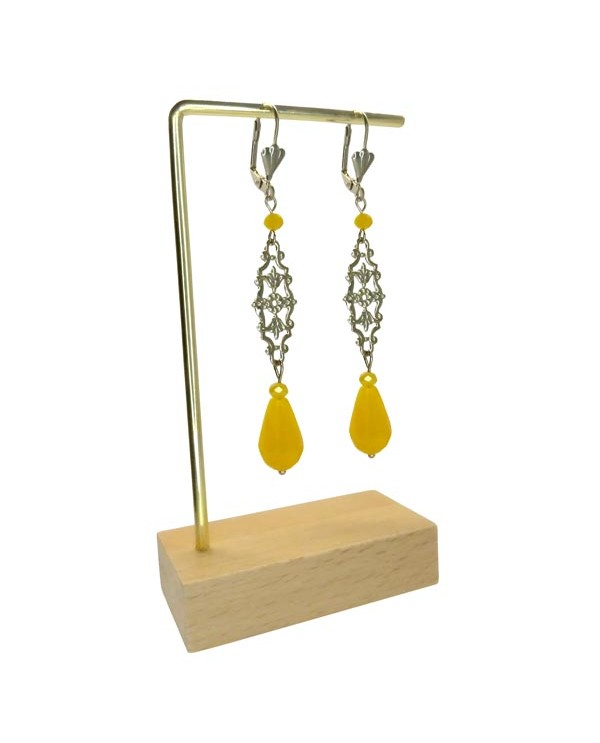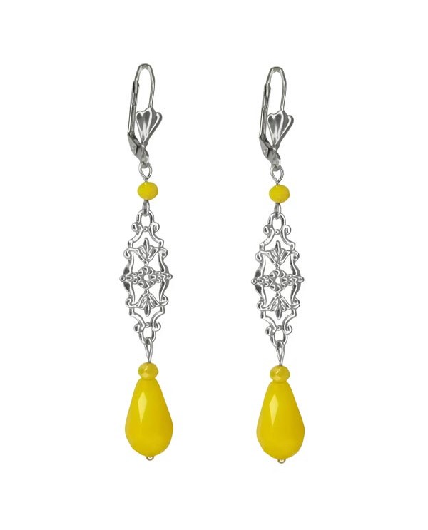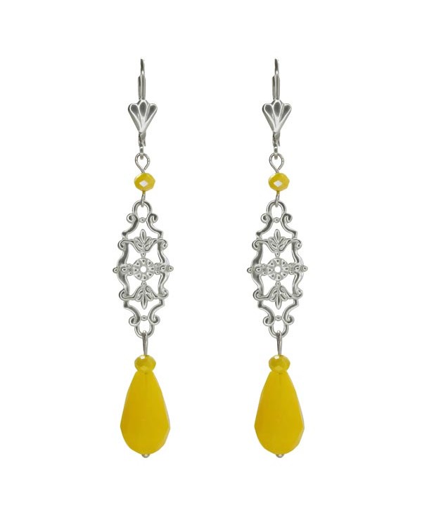 Avec des attaches dormeuses décoratives, une dentelle argenté légère et délicate, et des perles et gouttes facettées d'un beau jaune lumineux, ces boucles d'oreilles pendante longues apporteront de l'énergie à votre style.