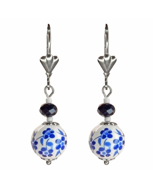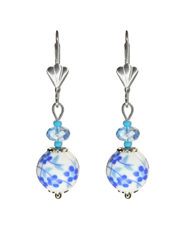 Une paire de boucles d'oreilles pendantes d'un classique intemporel. Voici l'élégance des délicates perles de porcelaine ornées de fleurs bleues (deux teintes de bleu au choix), surmontées de perles assorties.