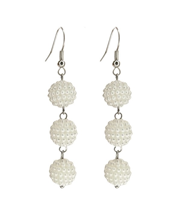Des boucles d'oreilles pendantes, 3 perles blanches nacrées, des boules qui ont l'air composées de mini perles. Elle sont très légères.