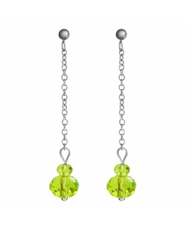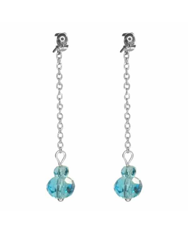 Voici une paire de Boucles d'oreilles pendante minimaliste, des puces en inox avec des chaînettes fines argentées et des perles translucides colorées , au choix bleu ou vertes.