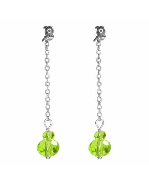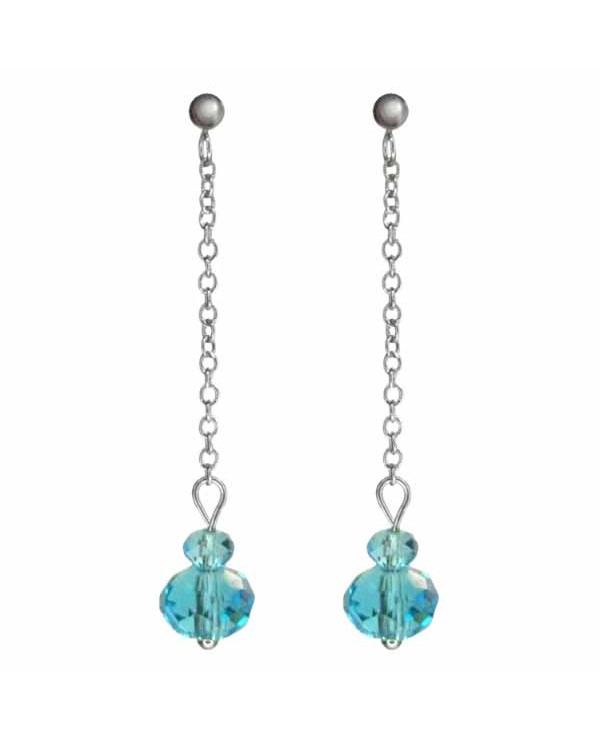 Boucles d'oreilles puces pendante minimaliste, chaînette fine argentée et perles à facettes translucides colorées.