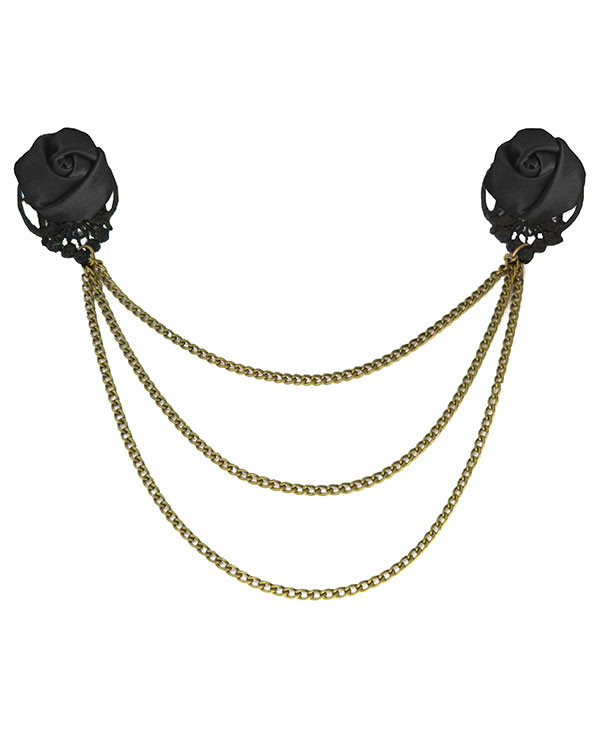 Broche gothique avec des roses noires, sur deux éléments de dentelle noire reliés avec des chaines couleur bronze, afin de régler l'écart.