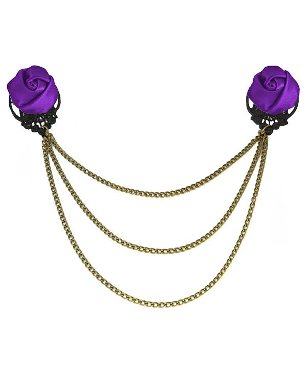 Un Broche gothique avec des fleurs de satin uni violet intense. Une double épingle (un bouton de rose de part et d'autre) qui permet de décorer un corsage, maintenir les bordures d'un gilet en maille, ou orner un pull trop basique.