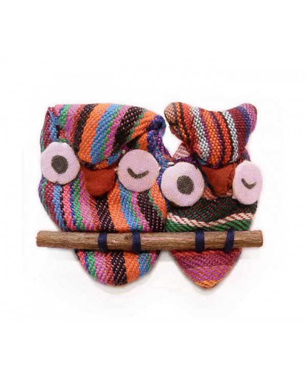Broche. 2 hiboux sur leur branche en tissu multicolore. à dominante rose