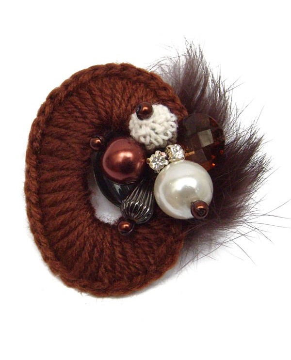 Broche ovale en perles, laine et strass. Couleur Marron Chocolat avec des touches de Blanc.