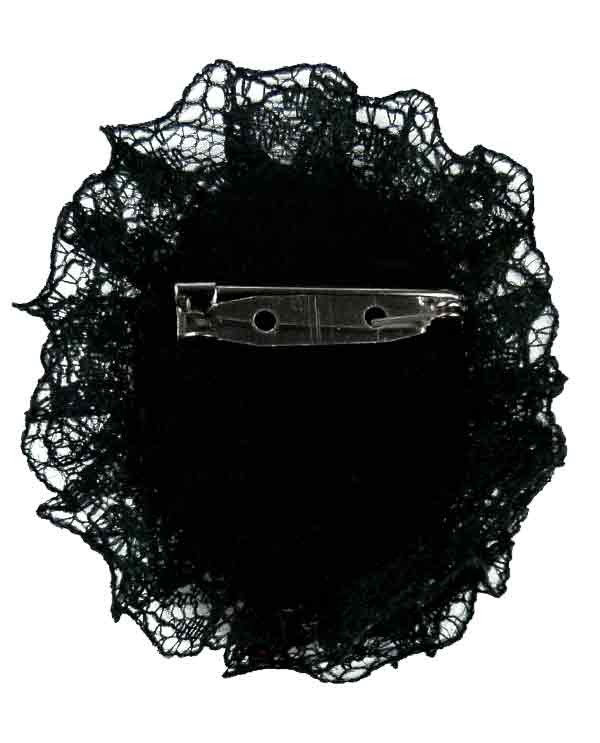 Façon broche ancienne, de la dentelle noire plissée, un cabochon ovale a strass (rouge) sur support couleur bronze doré.