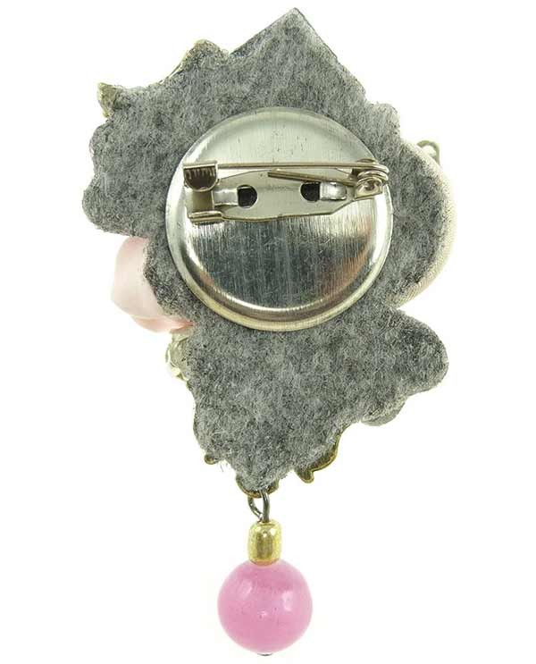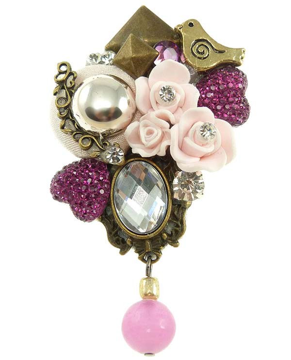 Une broche romantique, rassemblant de manière baroque un pèle-mêle d'éléments rose.