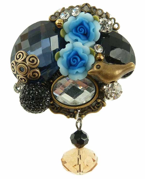 Une petite broche baroque, dont l'accroche visuelle principale est un paire de fleurs de fimo dégradées du bleu clair au bleu intense. Ces roses sont le centre d'attention d'un arrangement baroque de cabochons à facettes noirs et translucide. Des arabesques de couleur bronze dorés font l'effet d'une broche ancienne, divers petites strass de cristal blanche de tailles variées illumine l'ensemble par touche de brillance. Un oiseau se cache au milieu du bijoux.