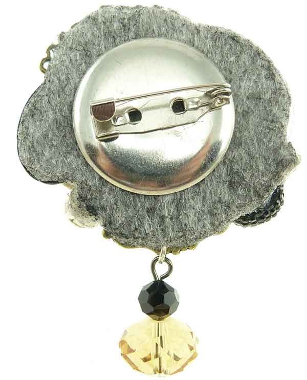 Une broche baroque avec deux fleurs de fimo en dégradé de bleu, du pâle à l'intense, contrastent avec des cabochons noires. Les décor façon bronze doré et les grains de cristal sont la note luxueuse de cet accessoire à épingler à votre poitrine.