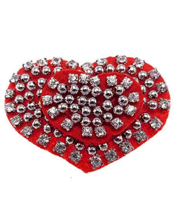 Broche coeur rouge Faite de strass en cristal et perles de couleur argentée, cousues sur du tissu en feutrine d'un très beau rouge passion intense.