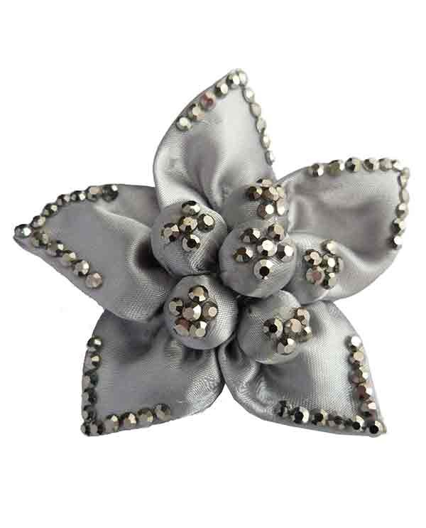 Une broche en forme de fleur en tissu argenté avec des strass anthracites. Ce type de fleur japonaise s'appelle kanzashi. Ici elle est en satin, cela donnera une allure de fête à un vêtement basique.