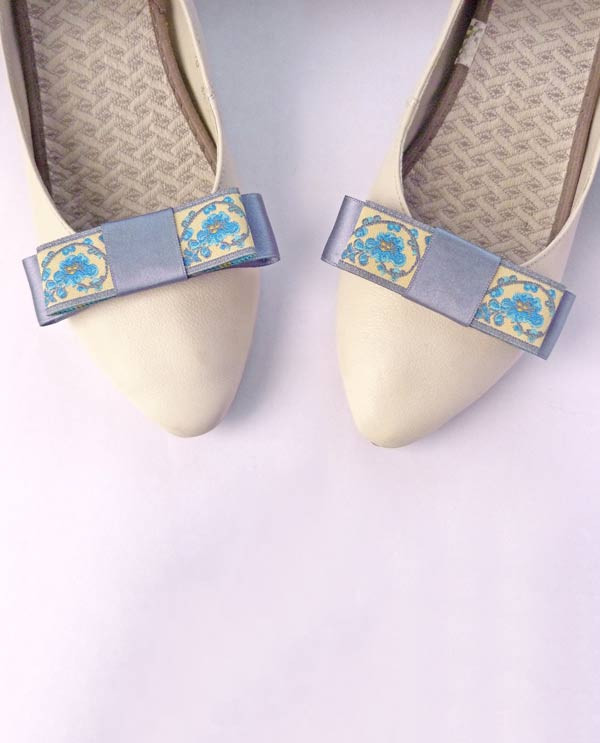 Clips à chaussures noeud bleu et beige à fleurs (motifs brodés rétro).