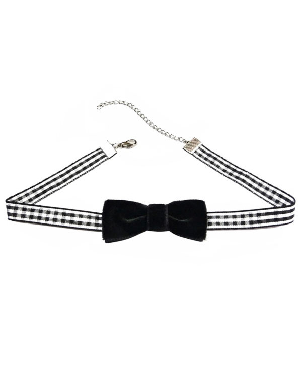 Collier ras de cou en tissu a carreaux noir et blanc, orné d'un noeud papillon féminin en velours noir.