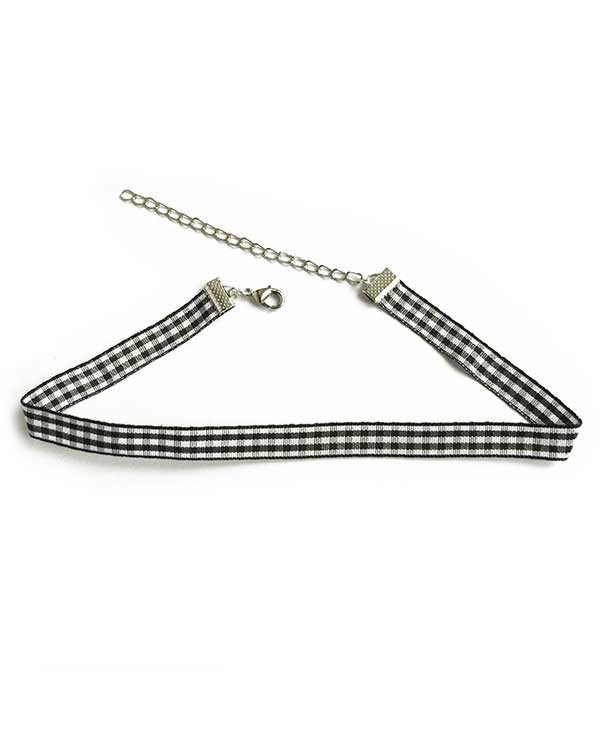 Collier ras de cou fin à carreaux noirs et blanc de type motif vichy.