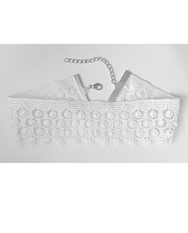 Collier type ras de cou avec sa dentelle blanche légèrement satinée, avec un beau motif de petites pastilles rondes.