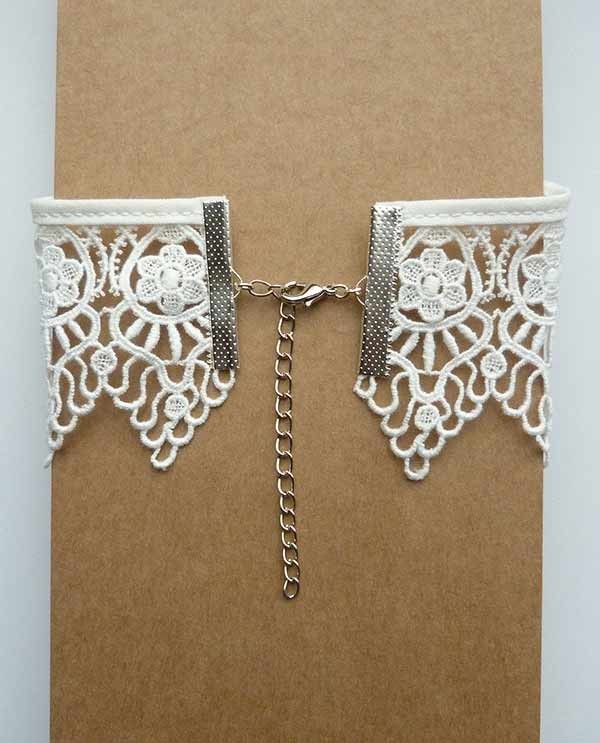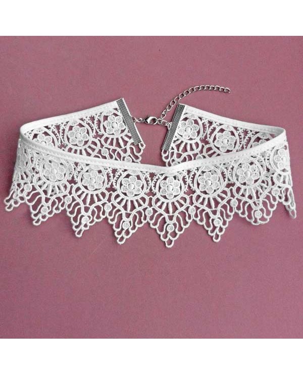 Collier type ras de cou avec sa dentelle blanche en coton avec ses fleurs et ses vaguelettes. C'est presque un faux col, qui habillera élégament votre cou.
