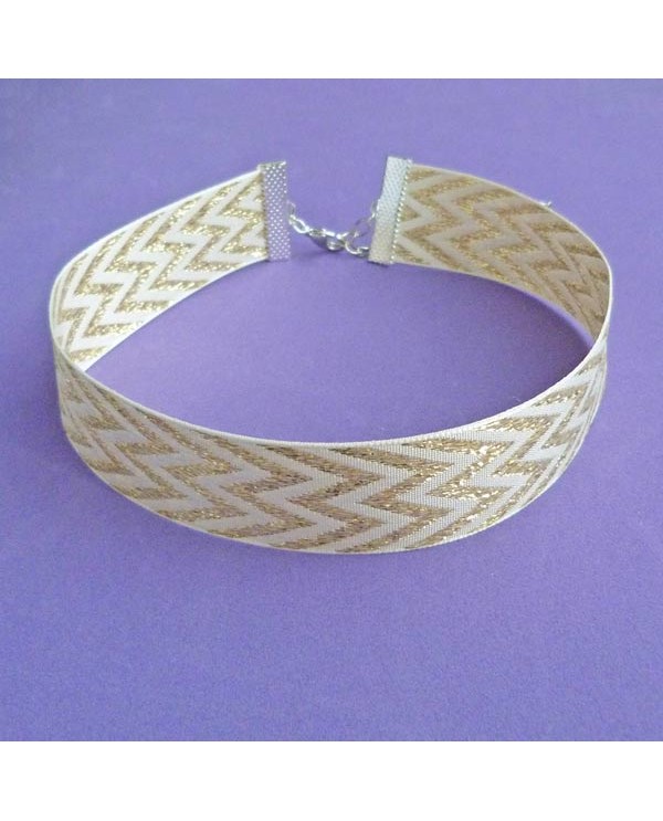 Collier ras de cou beige à broderie de chevrons dorés. Un style rétro art déco.
