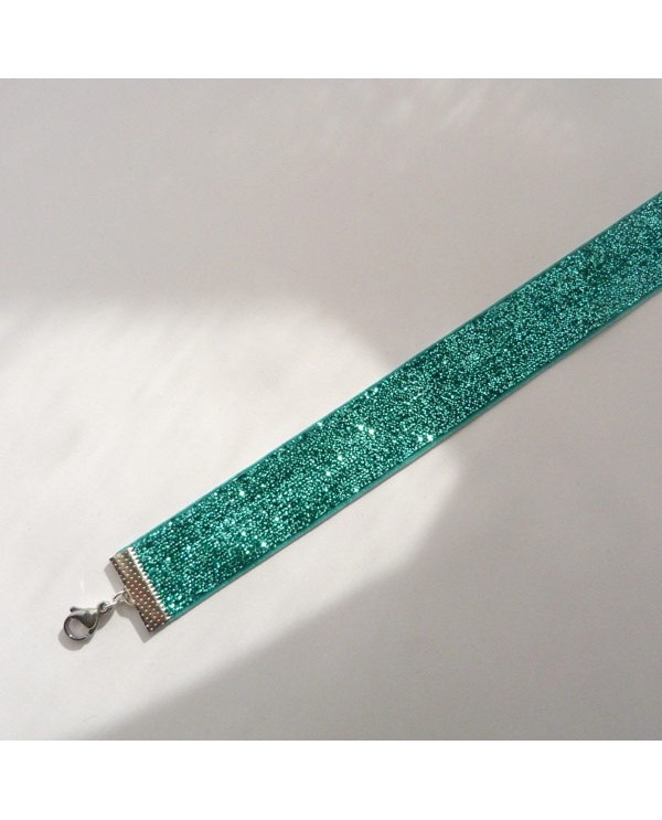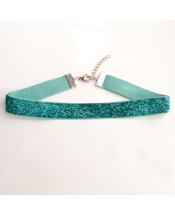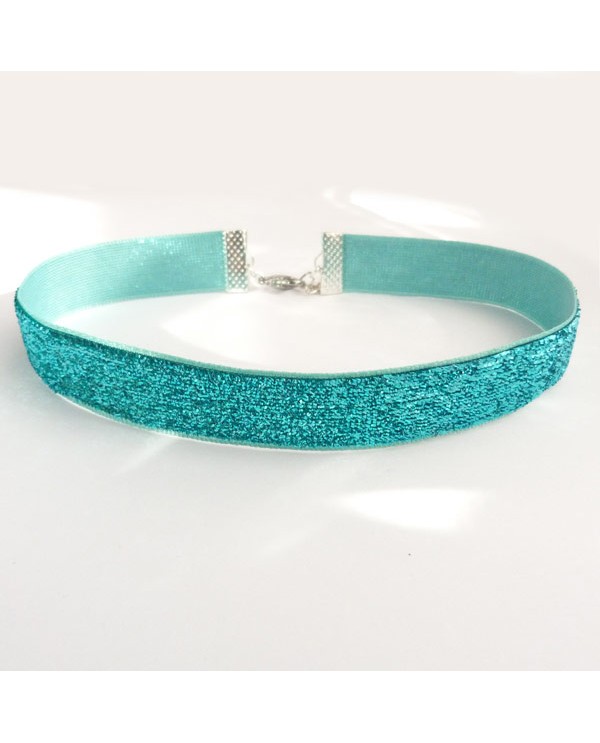 collier de style choker à paillettes bleu turquoise, en velours brillant pailleté.