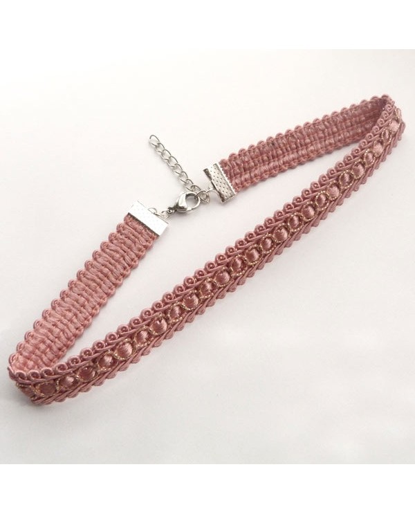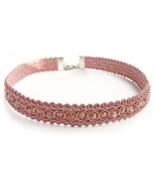 Collier ras de-cou en dentelle vieux rose avec des touches de doré, style baroque pour femme, fin discret et chic.